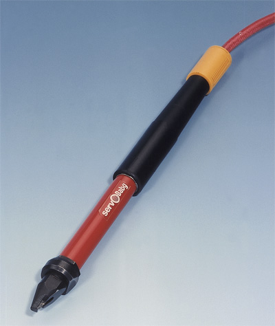 The joining angle can be adjusted depending on the thickness of the material. The air turbine drives up to 55 000 rpm. SERVO BABY can also be employed in conjunction with prefabricated creasing counters for their final finishing.